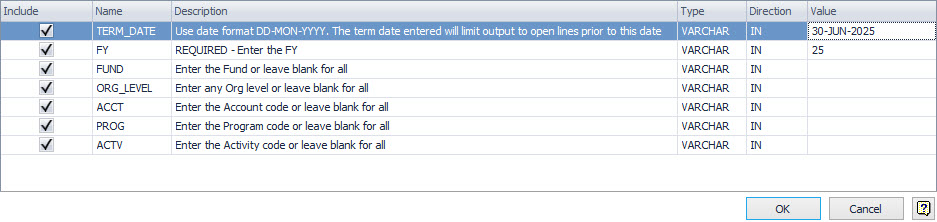 The query, Uncommitted_Encubmrances_that_will_roll_as_Committed_in_next_FY_RPTP.sql provides uncommitted encumbrances that will roll as committed in the next fiscal