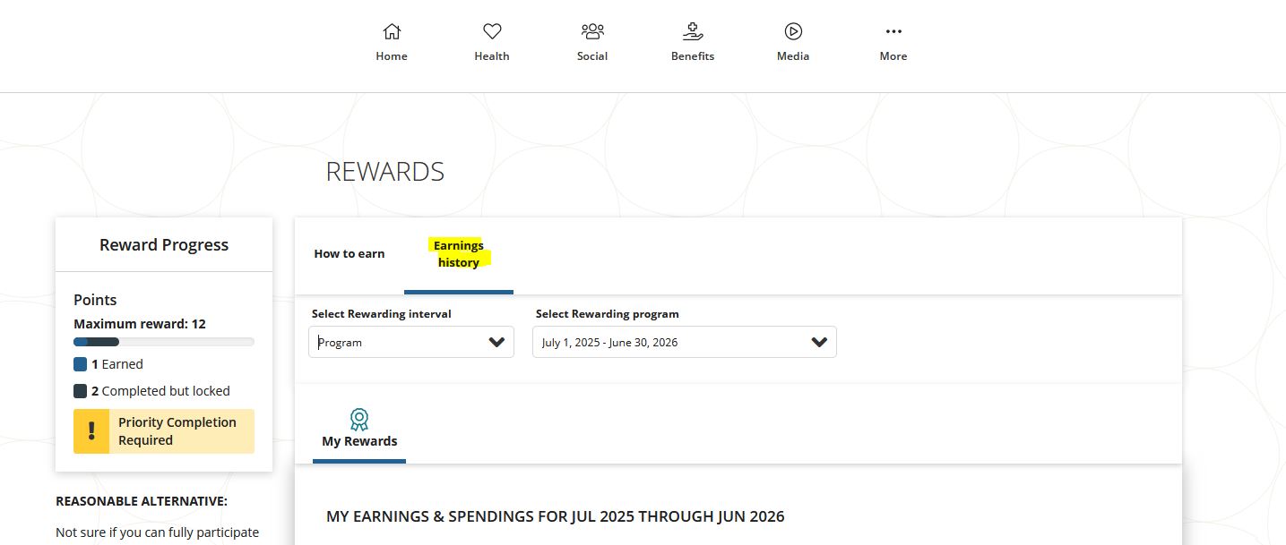 Any time you would like to confirm your point total for the program year, log in to your Personify Health account, hover over "Home" and click "Rewards." The Rewards page will outline your current point total. The Rewards drop down menu on this site has more detailed information including why there is a 12 point maximum and what a locked point is.